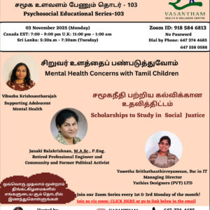 வசந்தம் தமி ழ் உளவளத்துணை நி லை யம் – சமூக உளவளம் பேணும் தொடர் – 103 03 November 2025 (Monday) Canada EST: 7:00 – 9:00 pm U.K: 11:00 pm – 1:00 am Sri Lanka: 5:30a.m – 7:30am (Tuesday) Zoom ID: 918 584 6813 No Password Dial by Phone: 647 374 4685 Phone: 647 558 0588