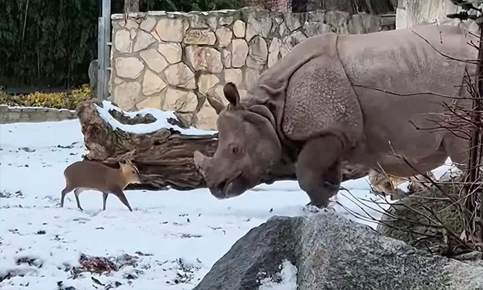 எனக்கு பயம் கிடையாது... காண்டாமிருகத்தை எதிர்த்து துணிச்சலாக சண்டையிட்ட மான் குட்டி