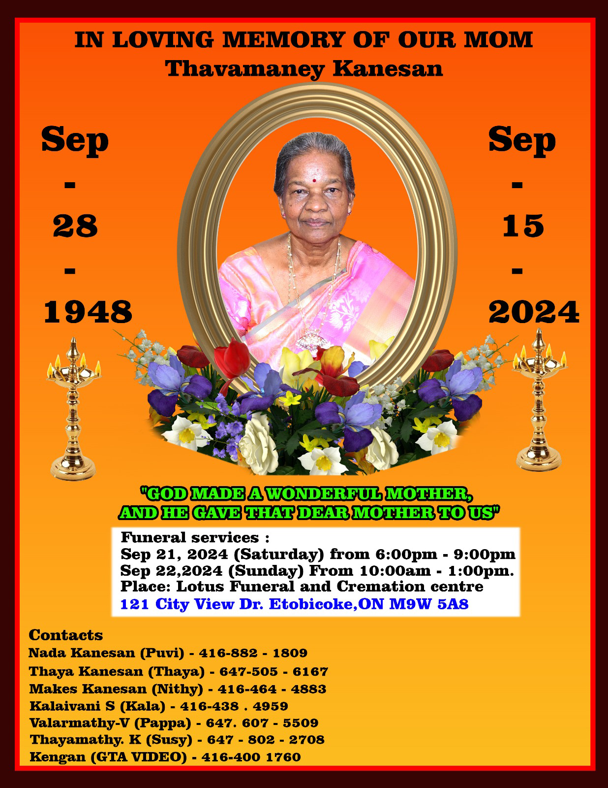 Lotus Funeral and Cremation Centre காலம்: September 21, 2024 சனி 6 p.m. - 9 p.m. September 22, 2024 ஞாயிறு 10 a.m. - 1 p.m.